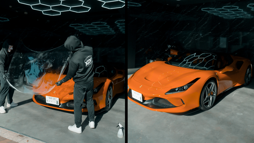 フェラーリ本来の美しい塗装を守るための透明プロテクションフィルム施工。走りの美しさを損なわず、飛び石や傷からボディを守ります。